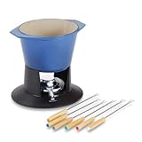 Forged and crafted by hand since 1925, Le Creuset Enameled Cast Iron cookware is a masterpiece. Each pieces is formed in its own sand mold and skillfully hand finished by more than 30 craftsmen. The result is a superior quality cookware that will provide a lifetime of everyday useFondue is one of those dinners that actively engages all ages and usually ends in laughter, as dueling forks often ensue and hunks of bread fall off into the melted cheese. The fondue set from Le Creuset is one of the most sturdy and attractive ones you'll find. Made of enameled cast iron, the black stand and colorful pot are extremely durable and resist chipping, cracking, staining, and odor absorption. Start by placing the pot on any gas, electric, induction, or ceramic stovetop burner to melt the cheese or chocolate (hot broth makes a good dip for slices of meat or fish). Then place the pot on the stand, where it will retain its heat admirably, especially when the burner underneath is lit. The set includes six stainless steel forks, each featuring a different colored end for instant recognition.