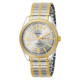 Arm Mns Rnd Twotone Stnl Stl Two Ton Bracelet Gray DialA unique, two-tone design and classy features define the Men's Two-Tone Expansion Band Dress Watch from Armitron. A sturdy, stainless steel case acts as a background to the gold-tone bezel that encircles a steely gray sunray dial with gold-tone and Arabic numeral indexes. A detailed outside minute track with white, circular indexes at the hours allows for specific time telling. Luminous-filled, gold-tone hands and a gold-tone outlined day and date display just inside three o'clock are complemented by the warm gold tones of the bezel and crown. Unifying the two-tone design of this stylish watch, the silver- and gold-tone expansion band fits snugly to the wrist. With a water resistance of 165 feet (50 meters), this dynamic timepiece is durable for outdoor activities and dressy enough for professional or dress wear.