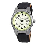 The simple style of the Armitron Men's Stainless Steel Easy-to-Read Watch offers all its title claims with an easy-reading dial. The brushed and polished, round, silver-toned, ion-plated, stainless steel case is topped with a matching round bezel. The green dial features black Arabic numerals at each hourly position along with black luminous hour and minute hands and a sweeping, black second hand. The analog dial displays a green luminous reflector ring with a printed black minute track and black hourly indices. The date window is clearly displayed next to the three o'clock hour. The comfortable, black, nylon strap securely fastens with a buckle clasp. This timepiece offers reliable Japanese quartz movement and is protected by a durable mineral crystal. The watch is water-resistant to a depth of 165 feet (50 meters).