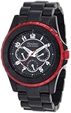 - Large round 42mm aluminum case finished in gloss black with red ridged bezel