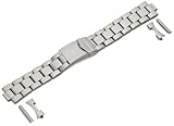 This is a Stainless Steel Replacement band in Popular 3-link design. The material is Stainless Steel in a Satin finish that gives the look of Titanium. The Band with is 20mm at the lug end and tapers to 18mm at the buckle side. The Buckle is a locking "v" style Locking Deployant Buckle. The total Band length is 185mm and there are links on both sides that are removable to obtain proper fit. There are also fine length adjustments within the buckle. There are two sets of end pieces, one set are straight 20mm straight tubes and another set are folded 20mm Curved Ends pieces to fit watch lugs that measure 20mm.